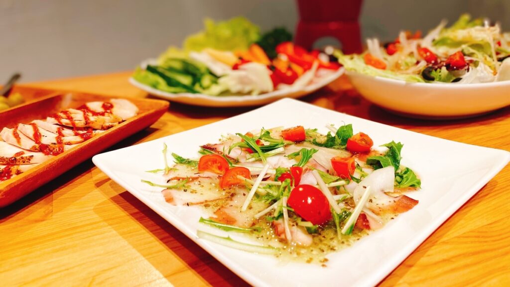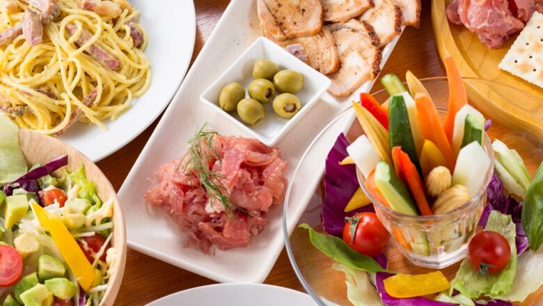 ・和風サラダ ・タコのカルパッチョ ・オリーブとローストチキンの前菜2種盛 ・熟成生ハム ・彩野菜のバーニャカウダ ・中華春巻き ・ジューシーな若鶏のから揚げ ・2種チーズのペンネボロネーゼグラタン ・チョコレートソースワッフル