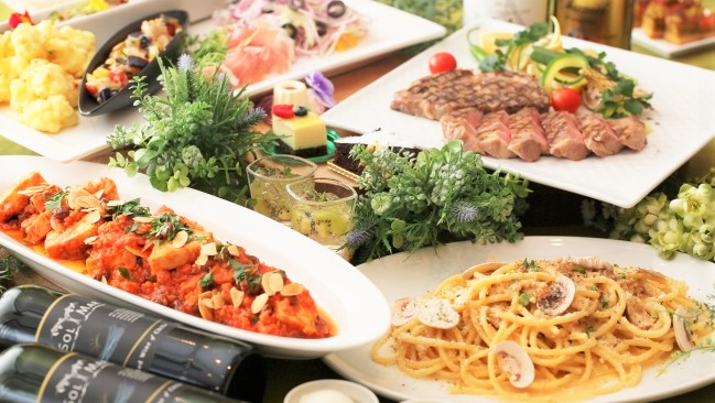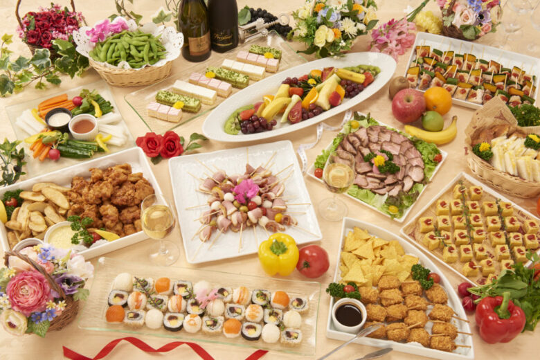 ・和風サラダ ・スモークサーモンのカルパッチョ ・オリーブとローストチキンの前菜2種盛 ・熟成生ハム ・彩野菜のバーニャカウダ ・ひとくちチーズ揚げ ・中華春巻き ・山形豚肩ロースステーキ ・2種チーズのペンネボロネーゼグラタン ・チョコレートソースワッフル ・シャンパンタワー ※シャンパンの本数は予約人数により異なります。