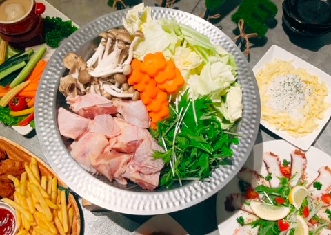 ・ユッケ風アボカドキムチ ・彩り野菜のバーニャカウダー ・ぷりぷり食感のタコのカルパッチョ ・シューストリングフライドポテト ・肉汁溢れるジューシー唐揚げ ・水炊き鍋orピリ辛麻辣火鍋 ・〆のチーズリゾット